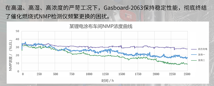 国内某锂电池涂布车间,陆续在三个月的实测数据显示,K8凯发国际NMP检测器运行稳定,实现免维护、无衰减、无中毒;而另外两家友商的催化燃烧式检测器,已出现明显衰减,测试数据偏差达到50%以上。